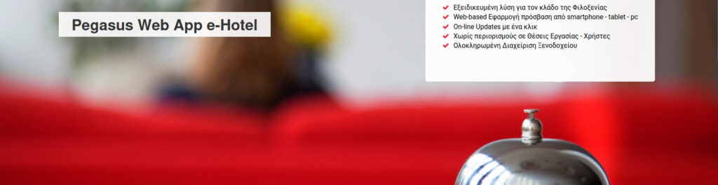 Το Pegasus e-Hotel Web App αποτελέι μία από τις πιο δημοφιλείς εφαρμογές μηχανογράφησης στο χώρο της Φιλοξενίας. Το πλήθος των δυνατοτήτων που προσφέρει σε συνδυασμό με τον εξαιρετικά εύκολο χειρισμό του αποτελούν σημαντικό κριτήριο επιλογής. Απευθύνεται σε ένα μεγάλο εύρος επιχειρήσεων από μικρές οικογενειακές μονάδες έως μεγάλες αλυσίδες ξενοδοχείων. Ανήκει στις κορυφαίες επιλογές των επιχειρηματιών καθώς είναι η πλέον ενδεδειγμένη ξενοδοχειακή εφαρμογή (PMS), παρέχοντας πρόσβαση από oπουδήποτε και oποτεδήποτε στο Διαχειριστικό της και multi – Language περιβάλλον. Ακόμη, με την προσθήκη των αντίστοιχων Modules, το Pegasus e-Hotel Web App μπορεί να εξελιχθεί σε μία πλήρη εμπορική και λογιστική εφαρμογή που καθιστά δυνατή την υλοποίηση διάφορων επιπλέον Λειτουργιών!